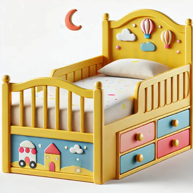 A colorful kids' bed with a cheerful yellow frame, rounded edges for safety, and built-in drawers for storage. Its playful design is perfect for creating a fun and functional space in a child’s room.